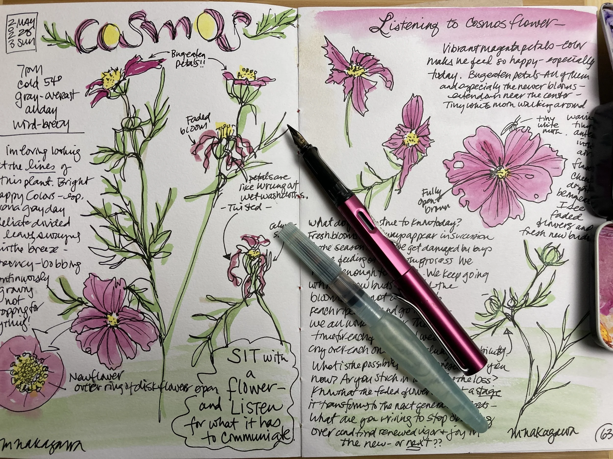 Melinda has kept nature journals for over 25 years and continues to be sparked with wonder by each journal she fills. She hosts a monthly online Monterey Bay Nature Journal Club to all, and Spark Circles, an online community forum for nature journaling with guest speakers, collective learning and mutual support as well as online nature journaling courses.